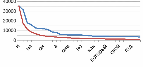 чем дальше от начала списка, тем менее предсказуема частота конкретного слова и тем больше она зависит от структуры корпуса.