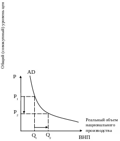Если предположить, что денежная масса М и скорость обращения денег остаются неизменными, следует вывод – чем выше уровень цен, тем меньше реальные запасы денежных средств и, следовательно, меньше Q – реальный объем выпуска, на который направлен спрос.