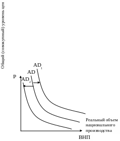Движение вдоль кривой AD отражает изменение объема совокупного спроса в зависимости от динамики общего уровня цен, совокупный спрос при этом не изменяется. Он может меняться под воздействием неценовых факторов совокупного спроса.