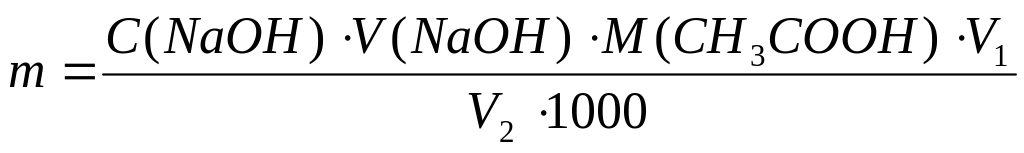 Массу уксусной кислоты в анализируемом растворе в граммах вычисляют по формуле:
