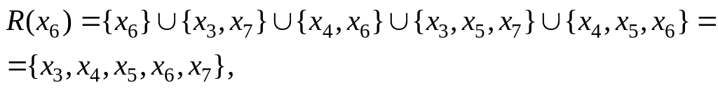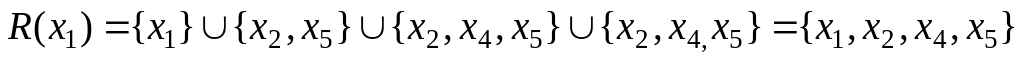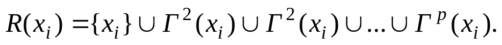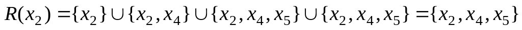 Таким чином, множина R може бути получено отримано послідовним виконанням (зліва на право) операція об’єднання в співвідношенні (1), до тих пір, поки «протікаюче» не перестане збільшуватися по розміру при наступній операції об’єднання. З цього моменту наступні операції не будуть давати нових членів множині і, таким чином буде утворено досяжна множина R . Число об’єднань, яке потрібно виконати, залежить від графа, але, очевидно, що число p менше числа вершин в графі.