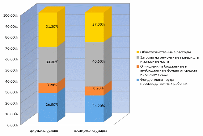 Материальные затраты после реконструкции в структуре себестоимости работ составили 20%.