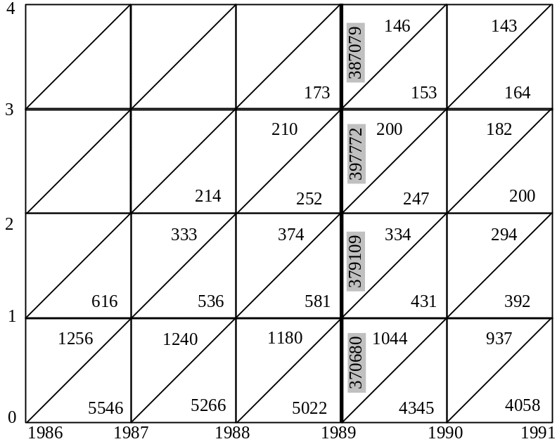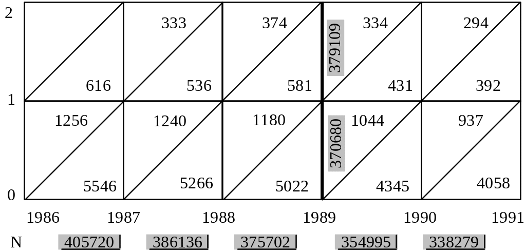 Сукупність померлих другого роду в 1989 році для дітей, народжених у 1988 році, обмежена вертикальним паралелограмом і охоплює М0 – 1 = 1044 + 431 = 1475 осіб.