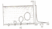 Рис. 15.8. Схема зарождения паровых пузырьков в микротрещине обогреваемой поверхности (а) и распределение температур по высоте сосуда с кипящей водой (б).