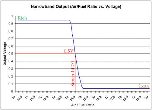 Датчик кислорода, применяемый в серийных системах впрыска, не способен регистрировать изменения состава смеси, заметно отличающиеся от 14,7:1, в силу того, что линейный участок его характеристики очень "узкий" (см. график выше по тексту). За этими пределами лямбда – зонд почти не меняет напряжение, то есть не регистрирует изменения состава ОГ.