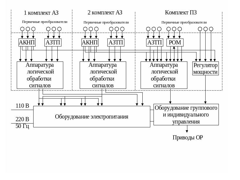 Сигналы от первичных преобразователей давления, уровня, температуры и других параметров поступают в аппаратуру защиты по технологическим параметрам (АЗТП). В АКНП и АЗТП производится необходимая обработка входных сигналов, включая формирование дискретных сигналов аварийной защиты при превышении параметром заданных уставок. Дальнейшая обработка аварийных сигналов происходит в аппаратуре логической обработки, где реализованы алгоритмы аварийной защиты и мажоритарной логики. Сформированный сигнал АЗ передается в оборудование электропитания и оборудование группового и индивидуального управления для съема электропитания с приводов ОР, что обеспечивает падение ОР под действием собственного веса.