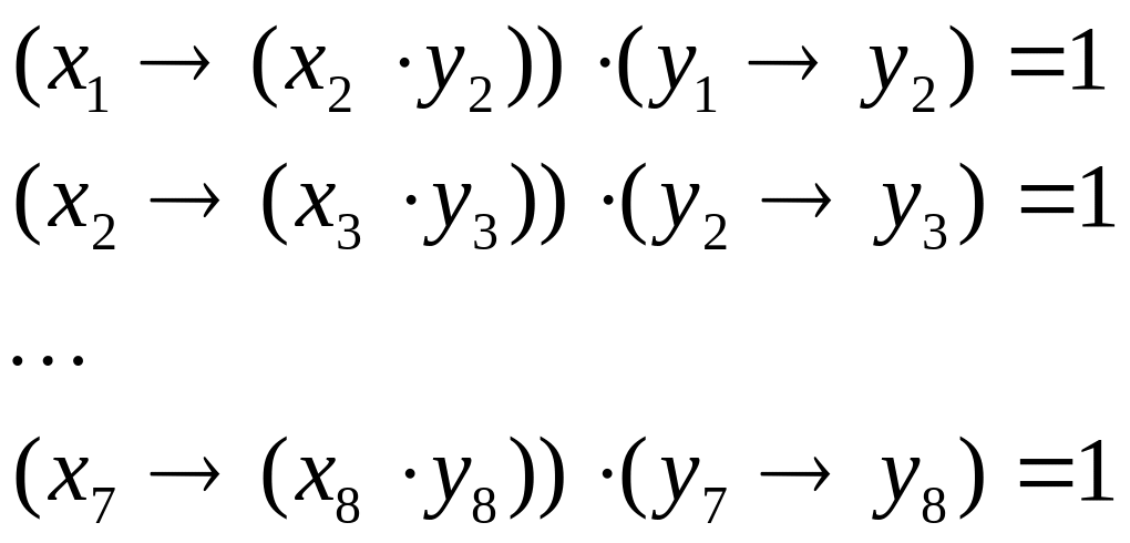 заметим, что первая скобка в каждом уравнении может быть переписана в виде произведения двух импликаций, например,