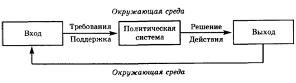 Он анализировал главным образом отношения системы со своей средой, которая в свою очередь состоит из комплекса других систем, входящих в глобальную социальную систему: экономической, культурной, религиозной, экологической, биологической, психологической, международной и др. Отношения между политической системой и ее средой определяются двоякого рода элементами: интересами, требованиями и поддержкой граждан, дающими системе импульс для действия и называемыми входом, и решениями, принимаемыми системой в качестве реакции на эти интересы, требования и поддержку, называемыми, выходом. Или, говоря иначе, вход идет со стороны среды и дает импульс системе, а выход является реакцией системы на импульс среды. Таким образом осуществляется обратная связь между входом и выходом. Выход вызывает обратную реакцию среды, которая порождает новый вход, на который система реагирует новым выходом и т.д. до бесконечности по принципу действия замкнутой кибернетической цепи. В схематическом виде модель Д.Истона представлена на рис. 2.