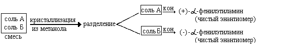 Рассмотрим принцип данного метода на примере расцепления рацемата -фенилэтиламина, который легко получить из ацетофенона и формиата аммония. В качестве расщепляющего агента в данном случае используют - природную (+)-винную кислоту. Входящие в состав рацемата (+)-амин и (-)-амин являются энантиомерами. Все их обычные физические свойства, в том числе и растворимость, идентичны. При добавлении ( + )-винной кислоты к рацемату образуются две соли: А и Б.