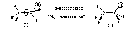 Рассмотрим молекулу этана (2). Повернем в ней правую СН3- группу относительно левой - на 60° (один из атомов водорода выделен):