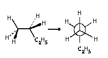 При попытке изобразить формулу Ньюмена, соответствующую конформации (4), мы столкнемся с тем, что "передние" атомы водорода заслоняют "задние". Для того, чтобы в формуле Ньюмена были видны все атомы водорода, слегка повернем "задний" атом углерода относительно "переднего" так, что бы атомы водорода, связанные с ним, выглядывали из-за "передних":