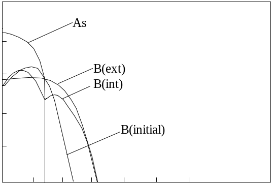 Хорошо известно, что при наличии в кремнии разных примесных атомов существует электрическое взаимодействие между ними [32]. На рис.1.5 иллюстрируется случай, когда мышьяк с высокой концентрацией влияет на распределение бора. В программе SUPREM II это взаимодействие моделируется посредством использования уравнения (1.10) для вычисления потока примесей. В примере, представленном на рис.1.5, диффузионный поток бора в области с высокой концентрацией примеси n-типа проводимости уменьшается, т.к. fv(B)=ni/n0, тогда как на краю профиля распределения мышьяка наблюдается падение концентрации из-за быстрого изменения fv и, следовательно, коэффициента диффузии бора.