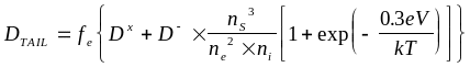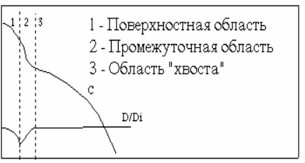2. Область хвоста, где коэффициент диффузии DTAIL повышается относительно собственного значения вследствие пересыщения кристаллической решетки кремния вакансиями из-за диссоциации пар P+V=. В этой области коэффициент диффузии описывается выражением