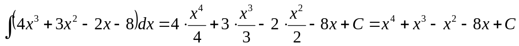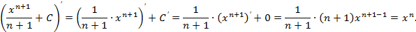 Каждая формула в этой таблице может быть легко перепроверена с помощью изученных ранее формул производных элементарных функций. Для этого достаточно вычислить производную от функций, стоящей в правой части формулы, и убедиться, что получилось подынтегральная функция. Рассмотрим, к примеру, интеграл от степенной функции: