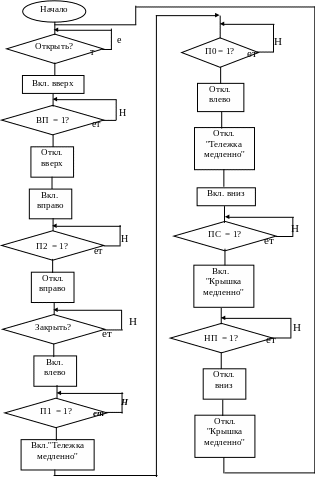 На рис. 12 приведена схема алгоритма управления работой напольно-крышечной машины, соответствущая представленному в приложении описанию. Все действия однотипны: контролируется поступление необходимого сигнала, после чего выдаются требуемые управляющие команды.