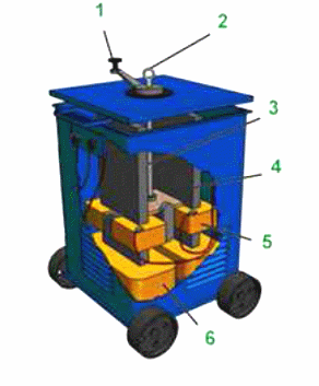 Рис.2 - Сварочный трансформатор, который является источником переменного тока. Трансформатор стационарный. Трансформатор состоит из стального сердечника (магнитопровода) и двух изолированных обмоток ( первичной и вторичной). Обмотка, подключенная к сети, называется первичной, а обмотка, подключенная к электрододержателю и свариваемому изделию, - вторичной.