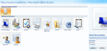 Программа Access хранит всю информацию о БД в одном файле с расширением «accdb» (что означает БД Access). Желательно заменить имя, которое Access выбирает автоматически (например, Databasel.accdb). Вместо него выберите, например, краткое название задачи индивидуального задания.
