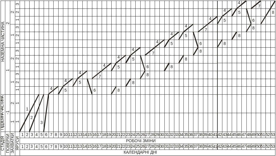 технологічно-організаційний розподіл секції на окремі захватки, ділянки та яруси;