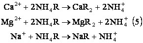 Следовательно, аммоний-катионированная вода является потенциально кислой и непригодной для питания ею паровых котлов. Поэтому аммоний-катионирование применяется при умягчении воды в сочетании с натрий-катионированием.