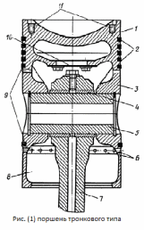 Тронковые поршни соединяются с шатуном поршневым пальцем. Для обеспечения газонепроницаемости полостей цилиндра поршень снабжают уплотнительными кольцами, а для предотвращения попадания масла в камеру сгорания — маслосъемными кольцами. Материалом для поршней служит чугун марок СЧ24-44 и СЧ28-48 и сталь. Поршни небольшого диаметра быстроходных двигателей можно изготовлять из алюминиевых сплавов (АЛ1, АЛ2, АК2, АК4). Такие поршни имеют малый вес и небольшие температурные напряжения в днище; недостатки поршней — незначительная износостойкость и большой коэффициент теплового линейного расширения.