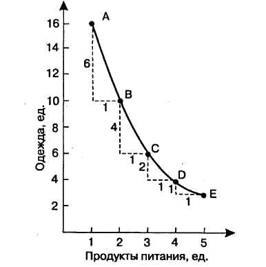 Значения предельной нормы замещения всегда отрицательны, так как увеличение количества приобретенных единиц одного блага предполагает уменьшение потребления другого, т. е. имеются разные знаки. Поскольку кривая безразличия выпукла вниз, к началу координат, то предельная норма замещения чаще всего уменьшается по мере увеличения потребления одного блага вместо другого. Это явление называют уменьшающейся предельной нормой замещения.