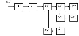 Выпрямленный блок питается от трехфазного трансформатора с увеличенным магнитным рассеянием. В цепь выпрямительного блока последовательно дуге включен блок транзисторов БТ.