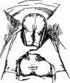 - руки тщательно моют, надевают стерильные перчатки и обрабатывают их спиртом. Операция проходит под наркозом (калипсол или сомбривин при наличии анастезиолога или в/в - S.PramedoK 2% - 1,0 +S.Dimedroli 1%-1,0);
