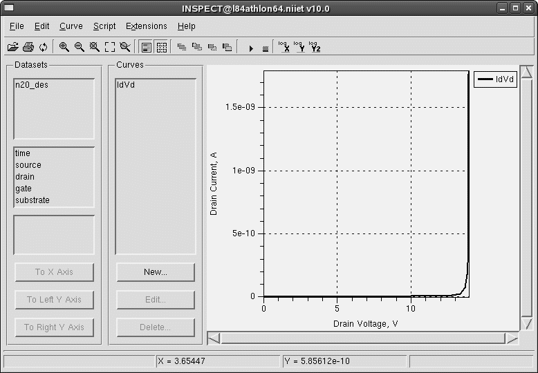 В данном случае пробивное напряжение определяется как напряжение на стоке, при котором из-за быстрого увеличения тока стока уравнения перестают сходиться и расчет обрывается. Используемый для этого командный файл INSPECT: