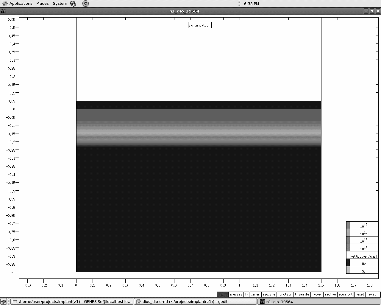 Структура, получаемая в результате моделирования имплантации бора в кремний через оксидный слой, показана на рисунке 2.27, а на рисунках 2.29-2.30 приведены расчетные концентрационные профили бора и фосфора соответственно.