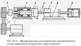 Современные машины для сварки трением достаточно сложны, состоят из большого числа следующих элементов и узлов (рис. 10.13): два зажима 5 и 7 для подлежащих сварке деталей 6; передняя бабка 4 со шпинделем, несущим на себе вращающийся зажим 5; узел 8, в котором размещен невращающийся зажим 7; привод вращения шпинделя с электродвигателем 1, ременной передачей 2 и устройством для натяжения ремней; фрикционная муфта 3 для сцепления шпинделя с приводным устройством, а также для торможения шпинделя; пневматические или гидравлические цилиндры 9, обеспечивающие создание необходимого рабочего (осевого) усилия машины; пневматическая, пневмогидравлическая или гидравлическая схема управления силовым приводом машины; электрическая схема управления машиной; станина машины, шкаф управления.