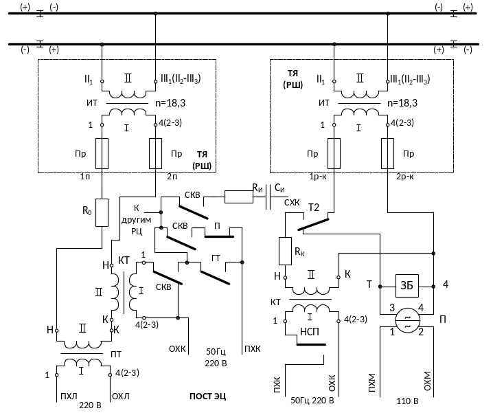 Для станций с автономной тягой защита от коммутационных перенапряжений и грозозащита не предусматривается. Рельсовые цепи без пропуска тягового тока, расположенные в зоне влияния электротяги, должны быть защищены от влияния тягового тока автоматическими выключателями АВМ-2 на 5А, установленными в ПЯ.