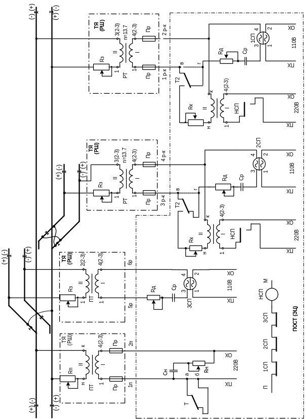 Рисунок 19 – Разветвленная РЦ переменного тока 25 Гц с реле ДСШ-13 и наложением кодовых сигналов на питающем и релейном концах