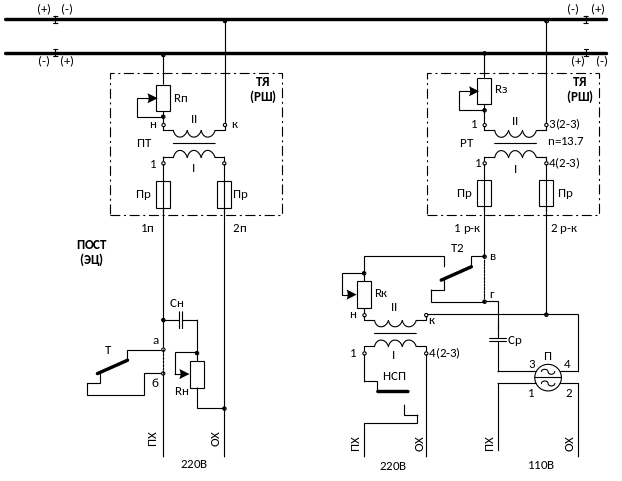 При наложении кодовых сигналов АЛСН только на питающем конце из схем (рисунок 13 и рисунок 15) исключают предохранители, контакты реле Т1 (Т2), путевого реле П (НСП), резистор RК и кодовый трансформатор КТ1 (КТ2), а между точками в и г устанавливают перемычку. При наложении кодовых сигналов только на релейном конце из этих же схем исключают контакты реле Т и искрогасящую цепочку (RИ и СИ) а между точками а и б устанавливают перемычку.