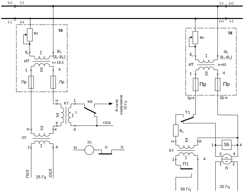 Рисунок 18 – Неразветвленная РЦ переменного тока 25 ГЦ с реле ДСШ-13 и наложением кодовых сигналов АЛСН на питающем и релейном концах |