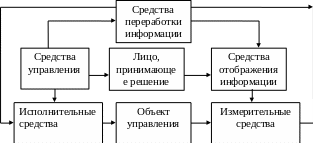 Для того чтобы человек участвовал в процессе принятия решения, ему также нужно дать возможность следить за состоянием объекта и внешней среды. Для этого он снабжается устройствами отображения информации, которые предназначены для преобразования информации в удобную для восприятия форму (чаще всего — в визуальную). Человек может вмешиваться в управление, воздействуя на исполнительные средства и на средства переработки информации с помощью средств управления (рис. 4).
