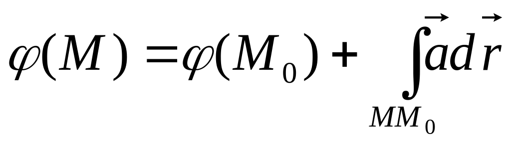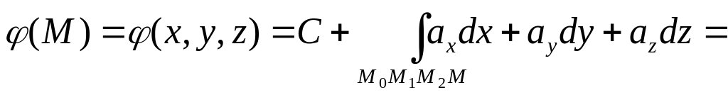 где интеграл берётся по любому пути, исходящему из некоторой фиксированной точки M0, где поле существует. Обычно в качестве пути выбирают ломаную, звенья которой параллельны координатным осям, например, ломаную M0M1M2M (рис. 6.5), а φ(M0) полагают равной С (С=const). Тогда