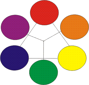 Рисунок ‑ 2 Цвета: Красный, Оранжевый, Желтый, Зеленый, Синий, Фиолетовый.Треугольник показывает три основных цвета, которыми пользуются художники. Остальные цвета (Оранжевый, Зеленый, Фиолетовый) получаются путем смешивания основных.