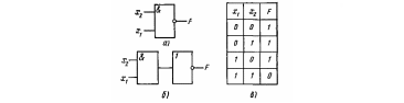 Логический элемент ИЛИ – НЕ. Условное обозначение логического элемента ИЛИ – НЕ показано на рис. 6.5, а. Он объединяет элементы ИЛИ и НЕ с очередностью проведения операций, показанной на рис. 6.5 , б. В связи с этим входным сигналам, равным единице, соответствует логический «0» на выходе, а при нулевых сигналах на всех входах F = 1. Для двухвходового элемента ИЛИ – НЕ соотношение иллюстрирует таблица истинности, приведенная на рис. 6.5, в.
