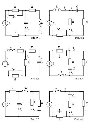 В электрической цепи (рис.9.1-9.24) происходит коммутация. В цепи действует постоянная э.д.с, параметры цепи и э.д.с. для задач приведены в таблицах 9.1 и 9.2. Требуется определить закон изменения тока во времени в ветвях цепи или напряжение на каком-либо элементе при переходном процессе в цепи второго порядка.