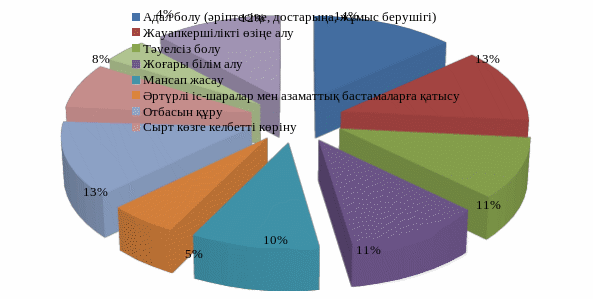 Жоғарыда айтылғандай қазақстандық жастардың негізгі өмірлік жоспарларының қатарына келесілер кіреді: білім алу, отбасын құру, қызмет сатысында өсу. Әрине, ескере кететіні жастардың арнайы бөлігі үшін өздерінің жас ерекшеліктеріне орай ұзақ мерзімдік тиімді өмірлік стратегиялар құрастыру өте күрделі, олар көбінде қысқа мерзімдік жоспарлар мен стратегиялардан оларды жүзеге асырудан құрылады. Мысал ретінде, бүгіндегі өз алдарына қойған міндеттерін шешуге ұйғарым жасап, мұндағы олардың болашақтағы көрінісі туралы көп ойлана бермейді. Сондықтан, жас респонденттердің жауаптарындағы өмірдің түрлі жақтарына берген ретсіздік пен қарама-қайшылық сұрауда көрініс тапқан, ол өзіндік түсіндіріледі. 14-суретте студенттердің өмірлік мақсат-мұраттарының көрсеткіштері көрсетілген.