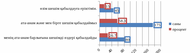 21-ші суретте көрсетілгендей бұл сауалнамада жоғары көрсеткішті ата-анам және мен бірге шешім қабылдаймыз деген 58,3 пайызды алып тұр. Ата -анам барлығына шешімді өздері қабылдайды деушілер 26,7 пайыз, өзім шешім қабыдаудаға еріктімін 15 пайызды құрайды.