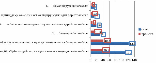 Диаграммада көрсетілгендей Бақытты отбасы деп санайтын жоғары көрсеткішті алып тұрған отбасы мүшелері арасындағы байланыс 40,3 пайызды құрап тұр, екінші орында махаббат пен өзара түсіністік орын алған, бір-бірін қолдайтын ал адам саны маңызды емес отбасы 36,7 пайыз, балалары бар отбасы 10,3 пайыз, табысы мол ертенгі күнге сеніммен қарайтын 6 пайыз, әрбір отбасы мүшелерінің даму және өзін-өзі жетілдіру мүмкіндігі бар отбасы 3,7 пайыз, жауап беруге қиналатындар 3 пайызды құрайды [20].