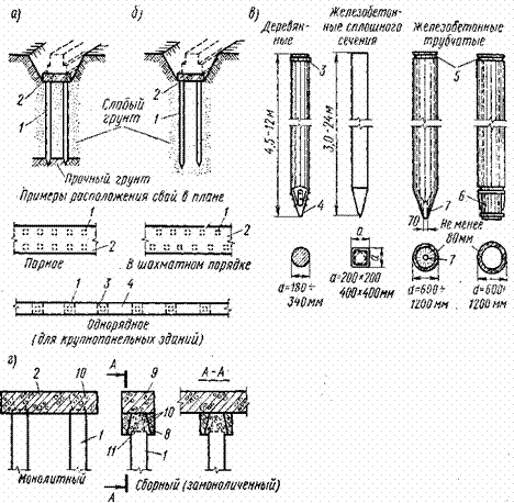 Рис. 35. Свайные фундаменты: а _ на сваях-стойках; б — на висячих сваях; в — виды забивных свай; г — свайные ростверки; 1 — сваи; 2 — ростверк; 3 — бугель; 4 — стальной башмак; 5 — стальной фланец, приваренный к арматуре сваи; 6 — стальной наконечник; 7 — отверстие; 8 — железобетонный сборный оголовок сваи; 9 — сборный железобетонный ростверк, привариваемый к оголовку; 10 — выпуски арматуры из свай; 11 — бетон