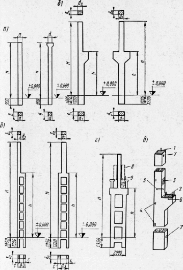 Типовые сборные железобетонные колонны для зданий без мостовых кранов изображены на рис. 2, а, для зданий с мостовыми кранами на рис. 2, б, д, причем эти колонны в зависимости от высоты здания, величины пролета и грузоподъемности крана могут быть одно- или двухветвенными.