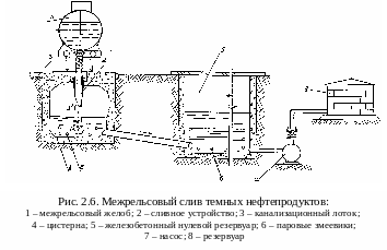 Более совершенной следует считать схему, приведенную на рис. 2.6, где показан закрытый прямоточный слив нефтепродуктов в межрельсовый желоб с боковой емкостью или емкостью, расположенной непосредственно под рельсами.
