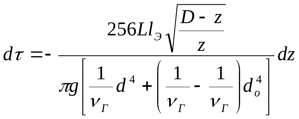 В общем случае слив из цистерн может происходить через сливной трубопровод и при избыточном давлении в цистерне. При этом режим истечения может быть турбулентный в начале слива, ламинарный – в конце. В частных случаях возможно истечение только при одном режиме. Рассмотрим решение этой задачи в целом. Положим, что за время dτ уровень нефтепродукта в цистерне понизился на dz. Слитый из цистерны объем составит gdτ. Используя условие неразрывности потока и уравнение Бернулли получают дифференциальное уравнение времени истечения dτ нефтепродуктов из железнодорожных цистерн от переменных zн и μс: