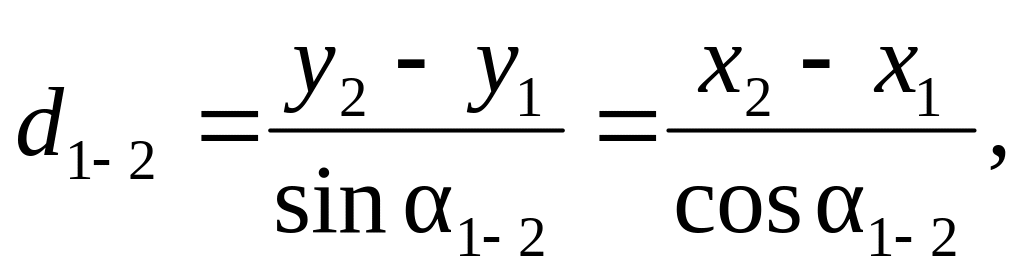 Обратная геодезическая задача. По известным координатам х1, у1 точки 1 и х2, у2 точки 2 требуется вычислить расстояние между ними d1-2 и дирекционный угол 1-2.