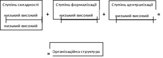 Організаційна структура в теорії управління визначається як абстрактна категорія, що характеризується трьома організаційними параметрами (рис 1.2): 1) ступенем складності; 2) ступенем формалізації; 3) ступенем централізації :