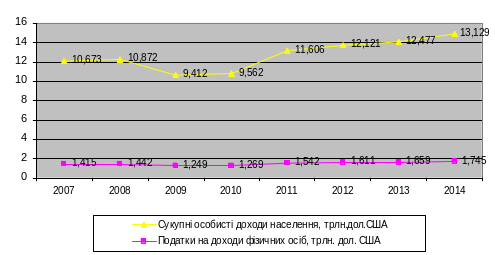 З рис. 1.9 видно, що сукупні особисті доходи населення в 2014 році виросли до 13,129 трлн. дол. США (сукупні особисті доходи склали 14,874 трлн. дол. США, а податки на доходи фізичних осіб - 1,734 трлн. дол. США). Зростання за 2007-2014 роки відбулося на 2,456 трлн. дол. США по сукупним особистим доходам населення та на 0,330 сукупні особисті доходи по податках на доходи фізичних осіб).