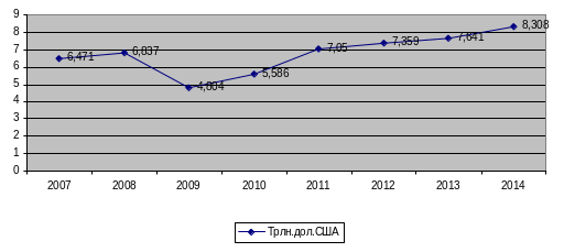 З рис. 1.1. видно, що динаміка ВВП за 2007-2014 роки має скачко подібну тенденцію. Загалом же за досліджуваний період відбулося зростання ВВП на 3338 млрд. дол.. США або на 23,7%.